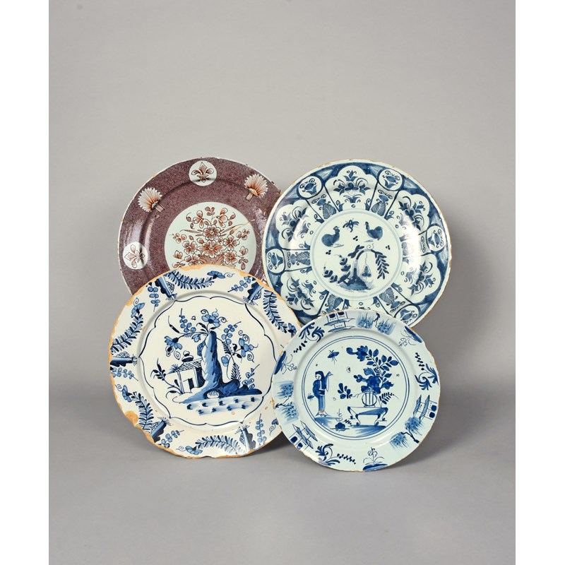 Three Bristol delftware chargers, c.1720-50, one painted in the Kraak manner with confronting cockerels within a floral panelled border, another in red monochrome with a basket of flowers on a powdered manganese ground, the last with a hut beside rockwork, and a Bristol delftware plate painted with a Chinese figure beside a low table, damages and repairs, 34.3cm max. (4)