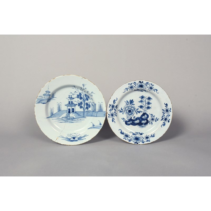 Two Lancaster or Liverpool delftware plates, c.1760, one painted in blue with a pagoda in an island landscape, the other with bamboo and peony issuing from holey rootwork, the former broken and riveted, 22.3cm max. (2)