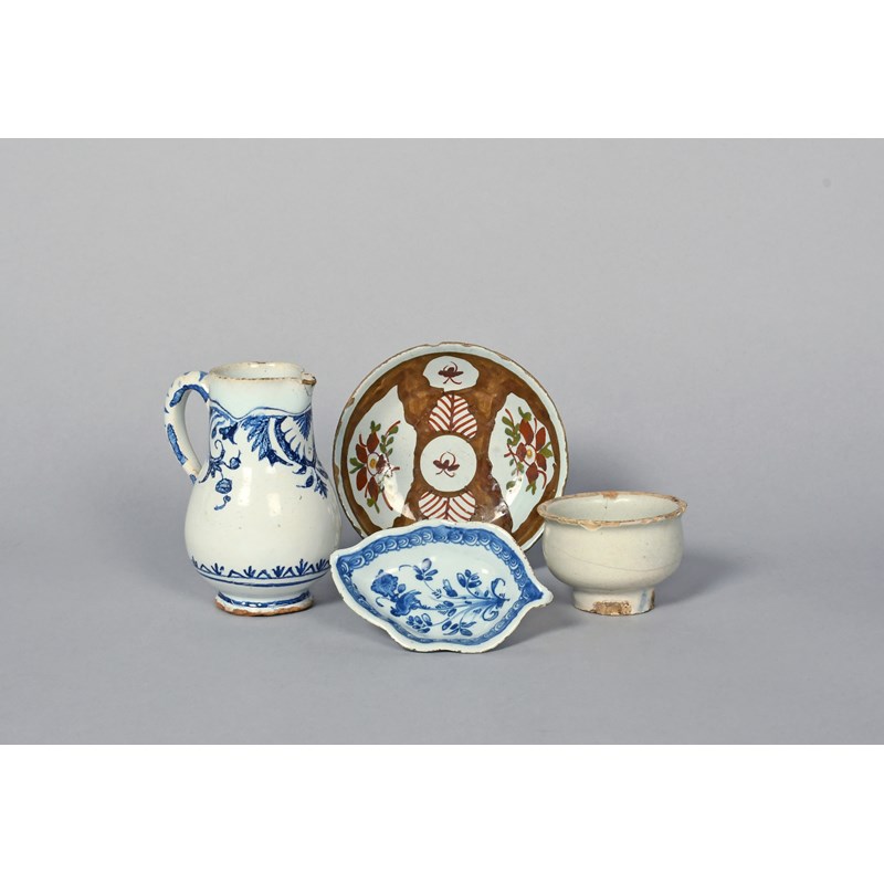 A delftware ointment pot, late 17th/early 18th century, decorated in a white glaze, a delftware leaf-shaped pickle dish, a saucer painted with flower panels on a brown ground, and a Delft milk jug painted with foliate sprays, 10.8cm max. (4)