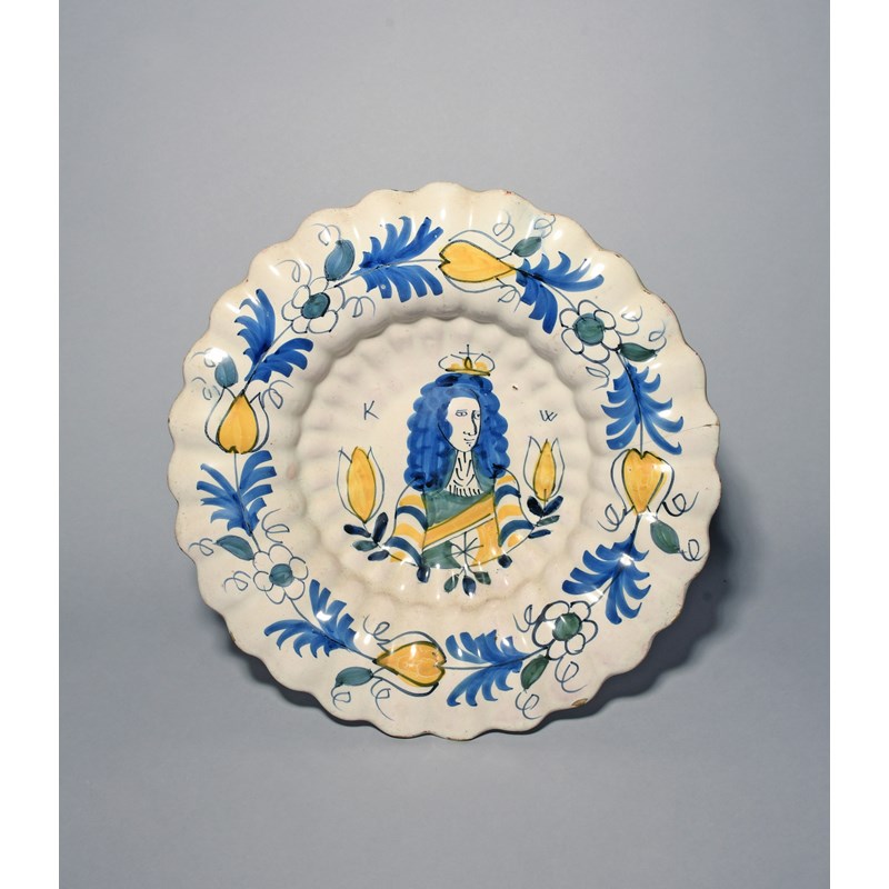 A Delft Royal lobed dish or charger, c.1690, moulded with rows of narrow flutes, painted in blue, green, black and yellow with a portrait of King William flanked by tulips, the rim with a continuous band of tulips and other flowers, a short rim crack, 34.3cm.