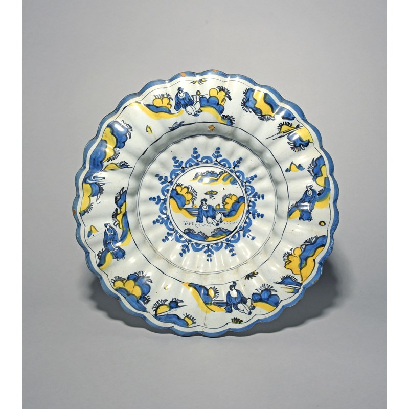 A fluted delftware charger, c.1690, painted in blue, black and yellow with a Chinese figure seated in a garden, the wide rim with further figures in landscapes, a rim crack, 34.5cm.