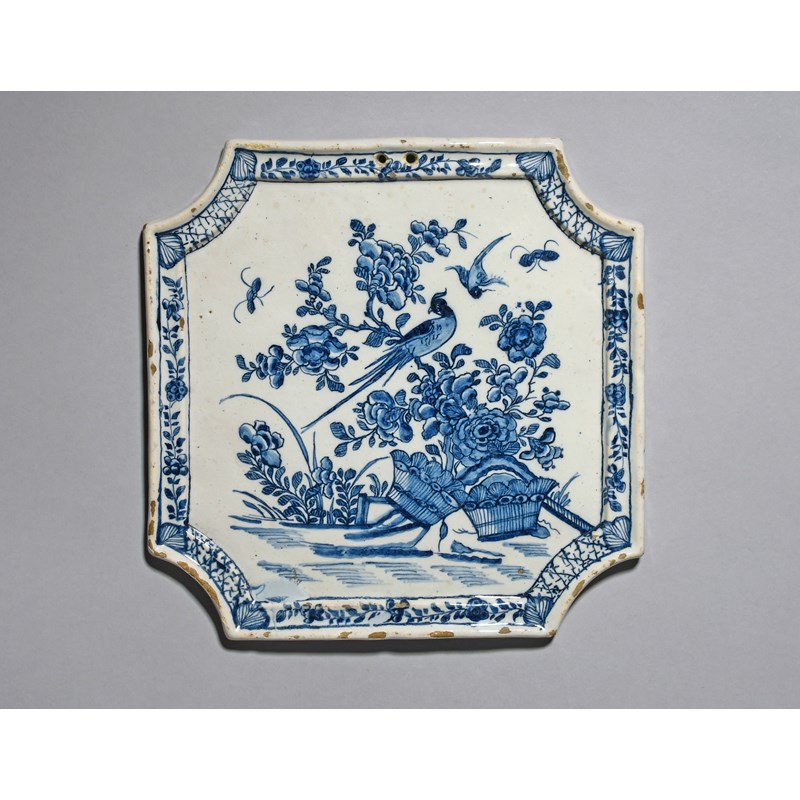 A Delft plaque, 18th century, of square form with chamfered corners, painted with long-tailed birds in flight and perched on flowering branches, with upturned baskets below, the rim with a panelled floral border, 24.6cm.