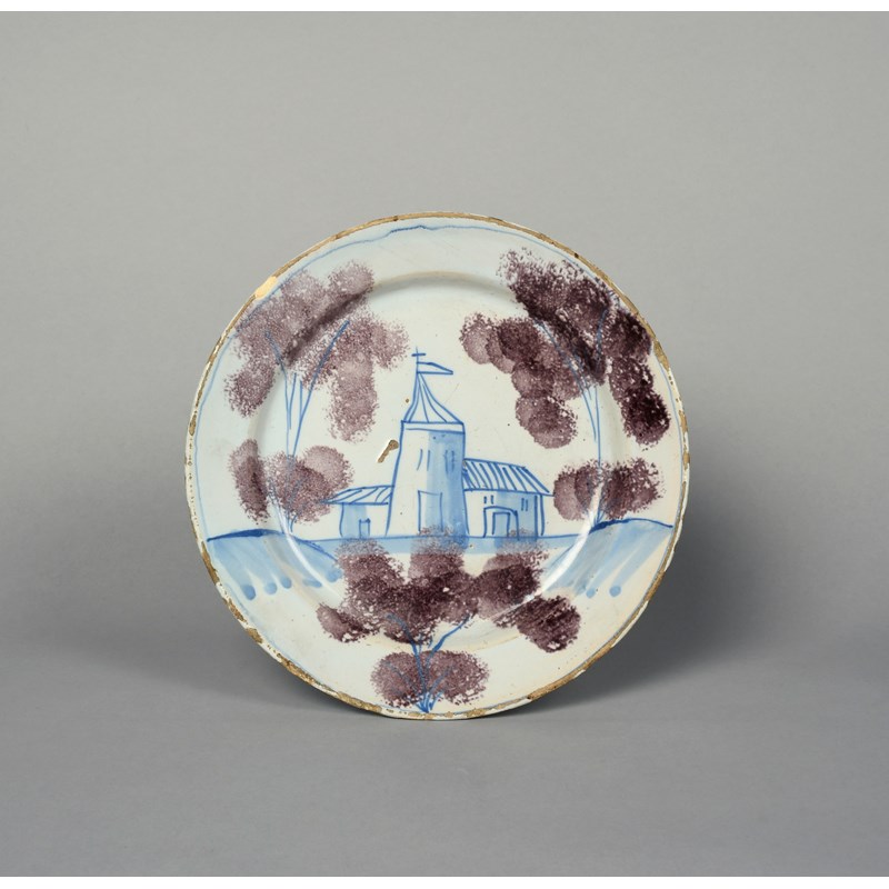 A delftware 'Farmyard' plate, c.1730, probably Bristol, painted in blue with a church flanked by tall trees with sponged manganese foliage, some rim chipping, 19.7cm.