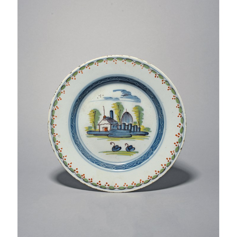 A delftware plate, c.1740, possibly Liverpool, painted in polychrome enamels with two swans swimming before low buildings and three trees, the rim with a berried border, 22.8cm.