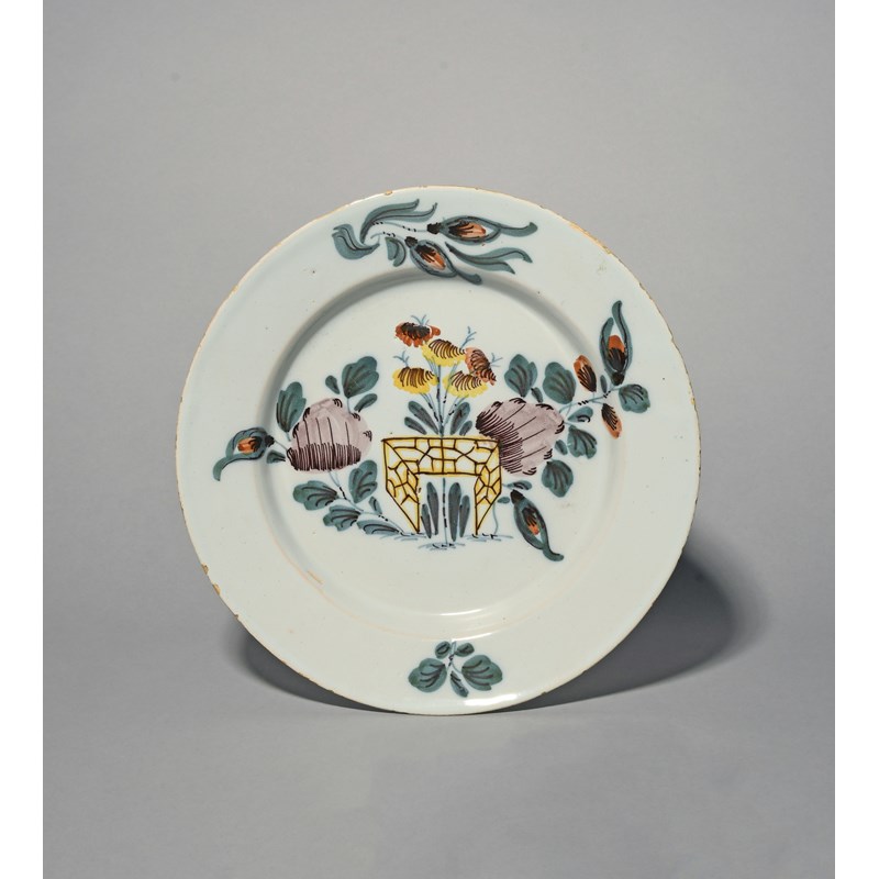A Bristol delftware Fazackerly plate, c.1740, painted with flowering branches beside an ornamental zigzag fence, 22.6cm.