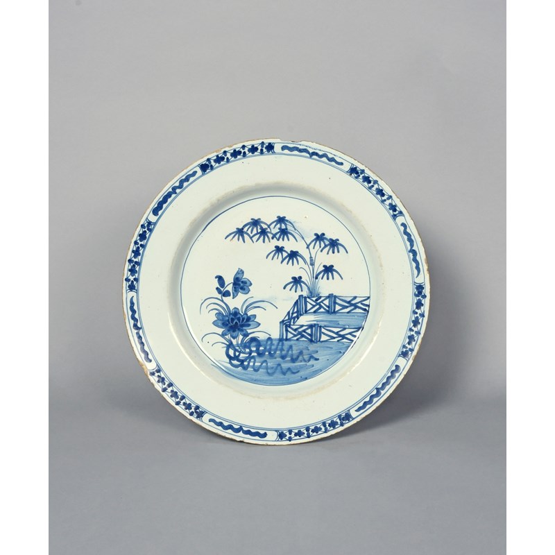 A large Bristol delftware charger, c.1740, painted in blue with flowering lotus before an ornamental fence and leafy bamboo, the rim with a narrow panelled trellis border, numeral 2 mark to the base, some rim chipping, 36.3cm.