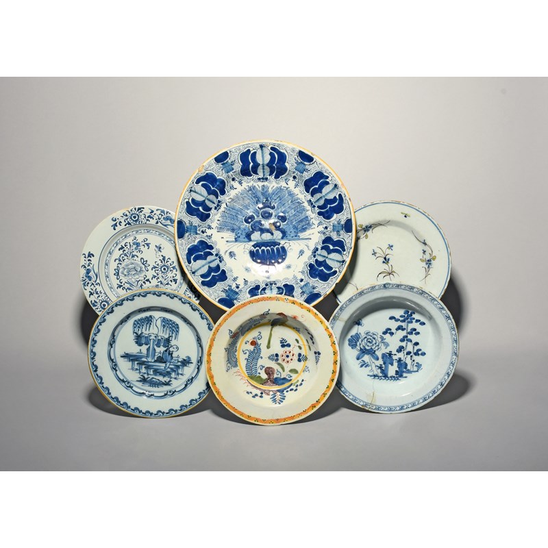 Six English and Dutch delftware plates, c.1730-70, including a polychrome soup plate with a parrot on a ring, a Dutch peacock charger, a plate and a soup plate painted with flowering branches, and a plate with a Chinese boy seated beneath willow, some damages, 32.3cm max. (6)