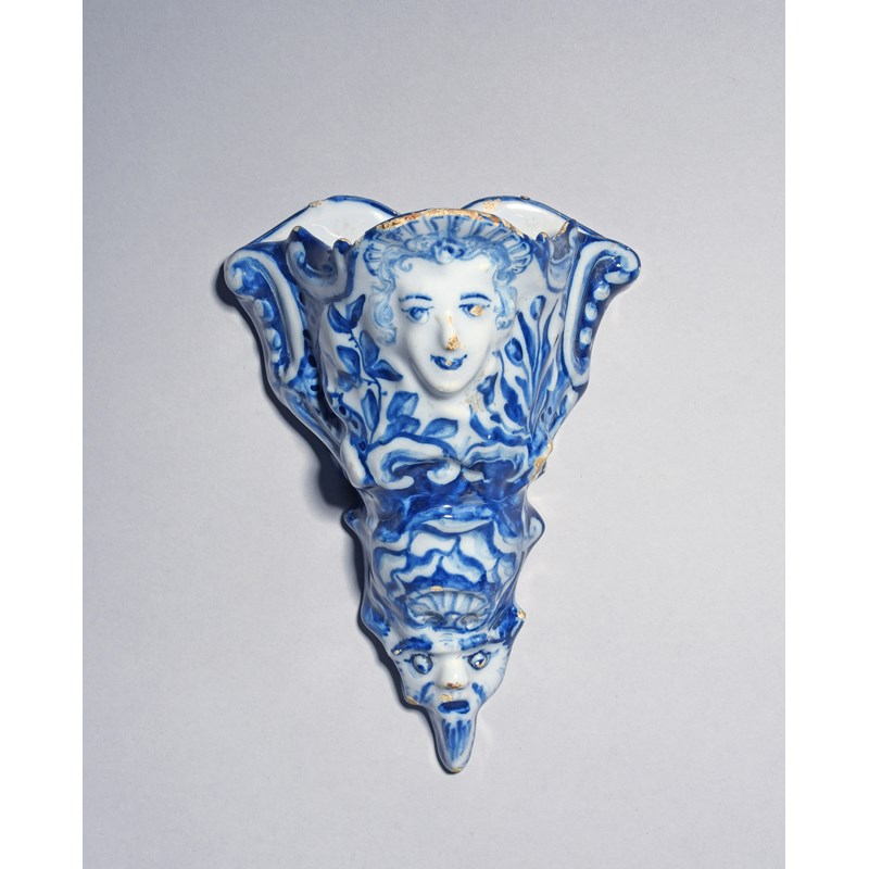 A delftware wall pocket, mid 18th century, moulded with a female mask to the top within leaf and shell scrolls, the base with a shell motif over a mythical bearded mask, all picked out in blue, some surface chipping, 19.5cm.