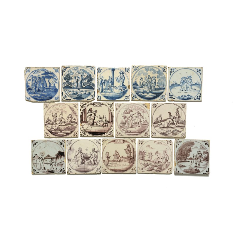 Fourteen English and Dutch delftware tiles, 18th century, painted in blue or manganese with scenes including the Stoning of Stephen, the Woman of Canaan, the Tribute Money, the Temptation in the Wilderness, the Return of the Prodigal Son, the Annunciation and Daniel Scattering Ashes in the Temple, within circular panels with stylized foliate corner motifs, some faults, 12.8cm. (14)