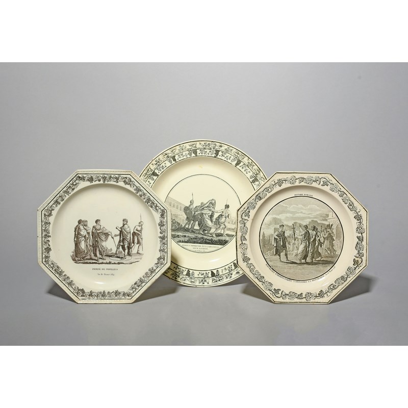 Three French creamware plates, late 18th/19th century, one Creil and printed with Magius rebuking the Campanians for their cowardice, two octagonal and printed with similar Classical scenes within grapevine borders, printed marks, 24.5cm max. (3)