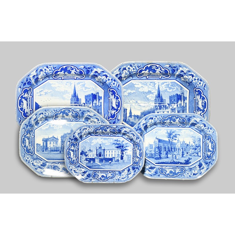 Five J & W Ridgway blue and white transferware chargers or meat dishes, 19th century, printed with scenes of colleges and other buildings in Oxford and Cambridge, the borders with panels of putti and sprays of convolvulus, the two largest chargers with draining channels, printed marks, 52.5cm max. (5)