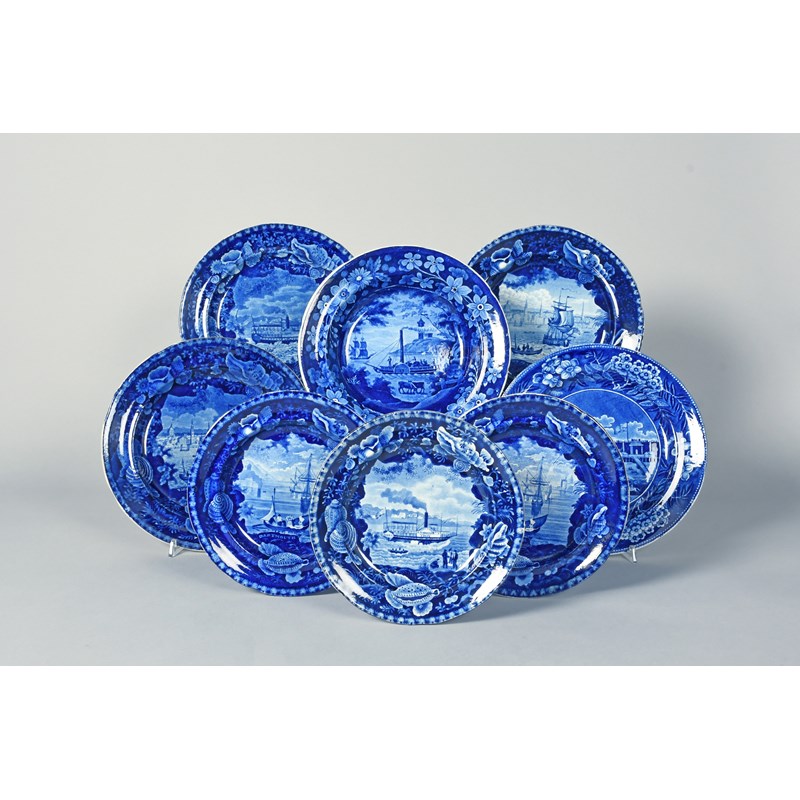 Six blue and white transferware plates by Enoch Wood, 19th century, depicting harbour scenes, sailing vessels and steamers within a wide border of shells and seaweed, some variously titled 'Dartmouth' and 'View of Liverpool', a Clews plate printed with the 'Landing of General Lafayette', and another soup plate with a steamer, impressed marks to some, 26cm max. (8)