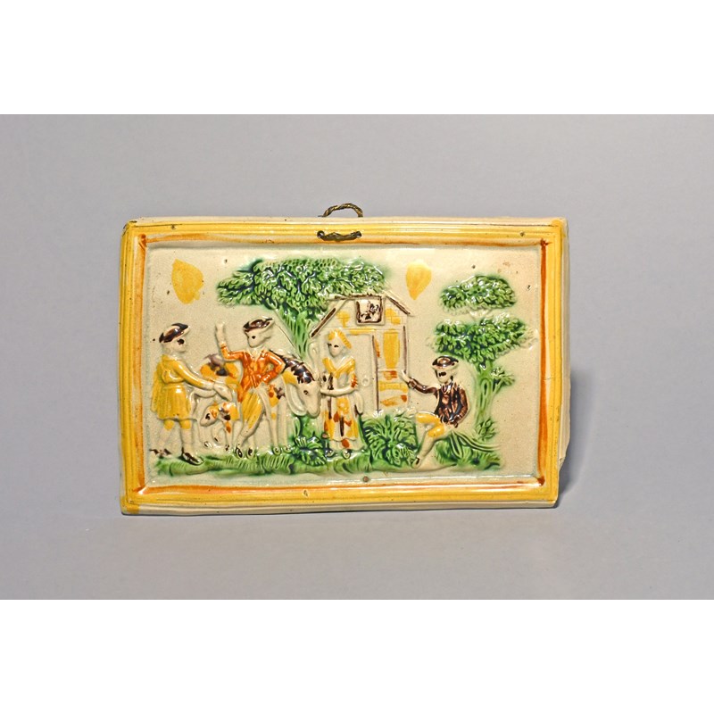 A Pratt ware rectangular plaque, c.1790-1800, moulded with a scene of huntsmen resting, with four figures, a horse and a dog outside a tavern flanked by trees, decorated in yellow, ochre, manganese and green, some chipping to the underside, 23.2cm.