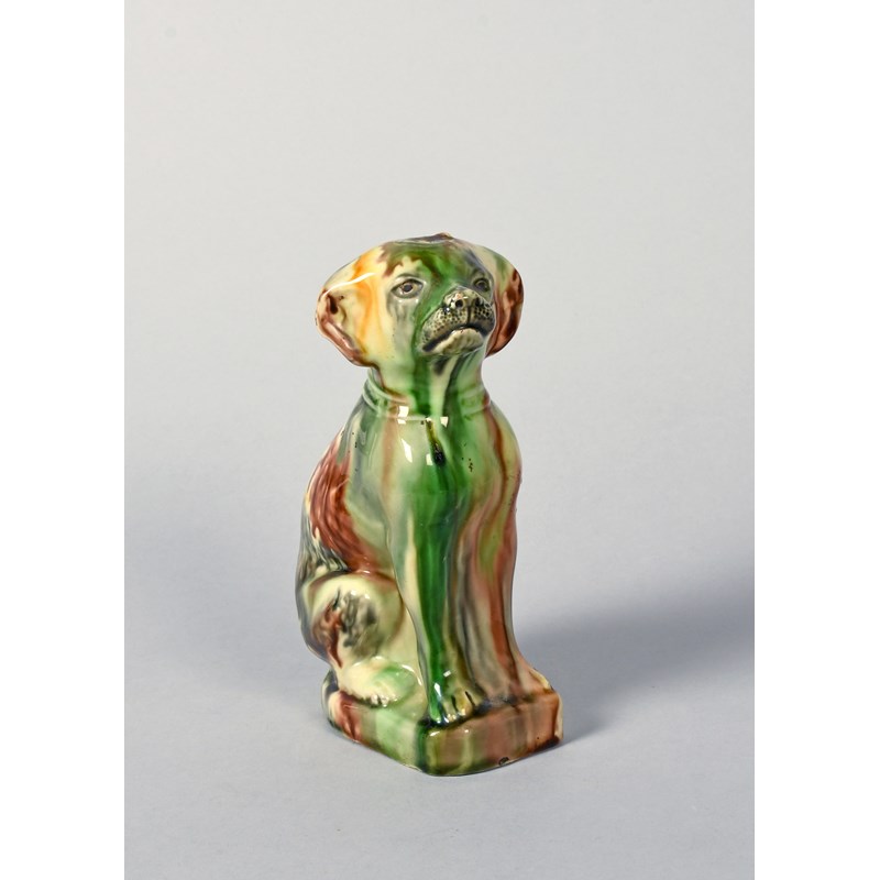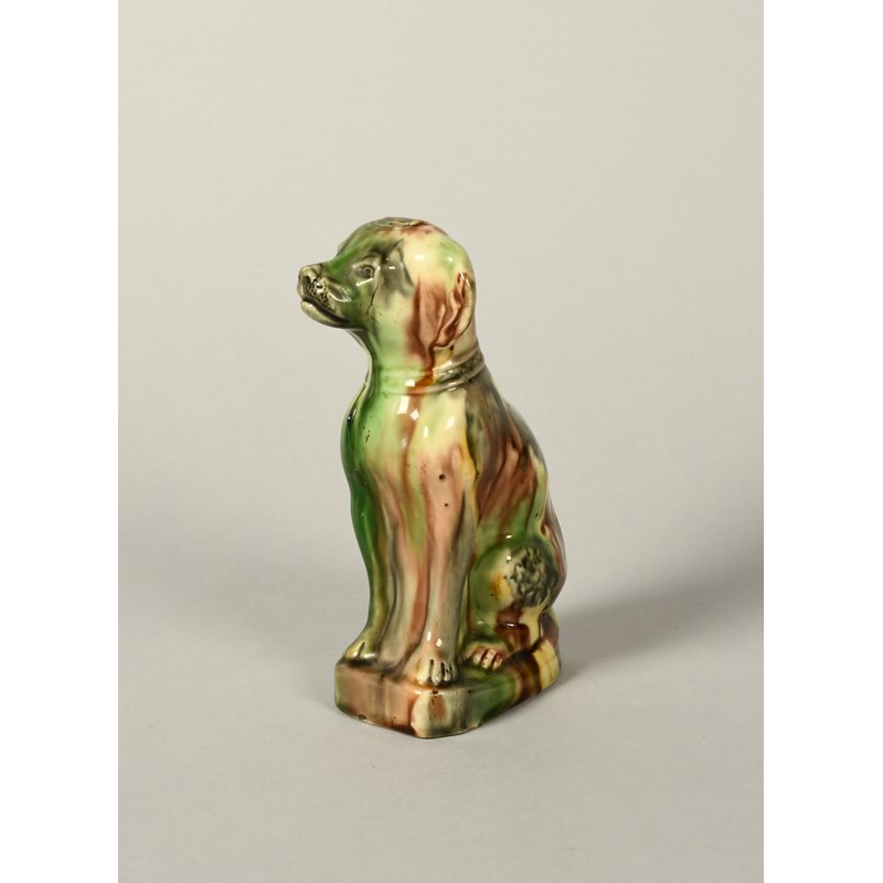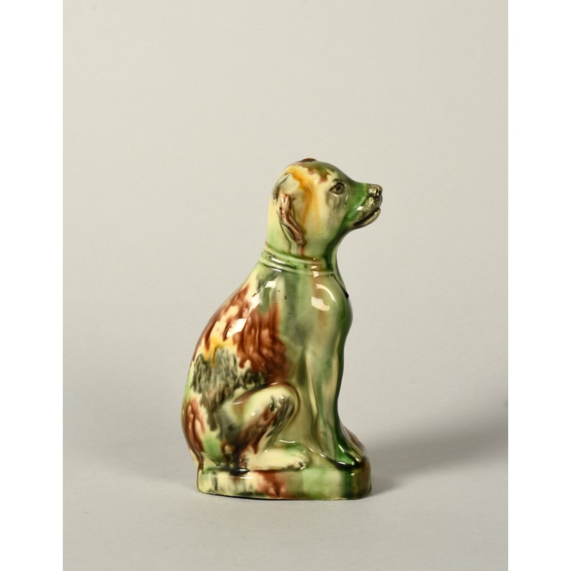 A Whieldon type creamware figure of a dog, 2nd half 18th century, seated on its haunches and moulded with a patterned collar, decorated in running glazes of green, ochre and manganese, possibly once fitted with a candle sconce, 17.2cm.