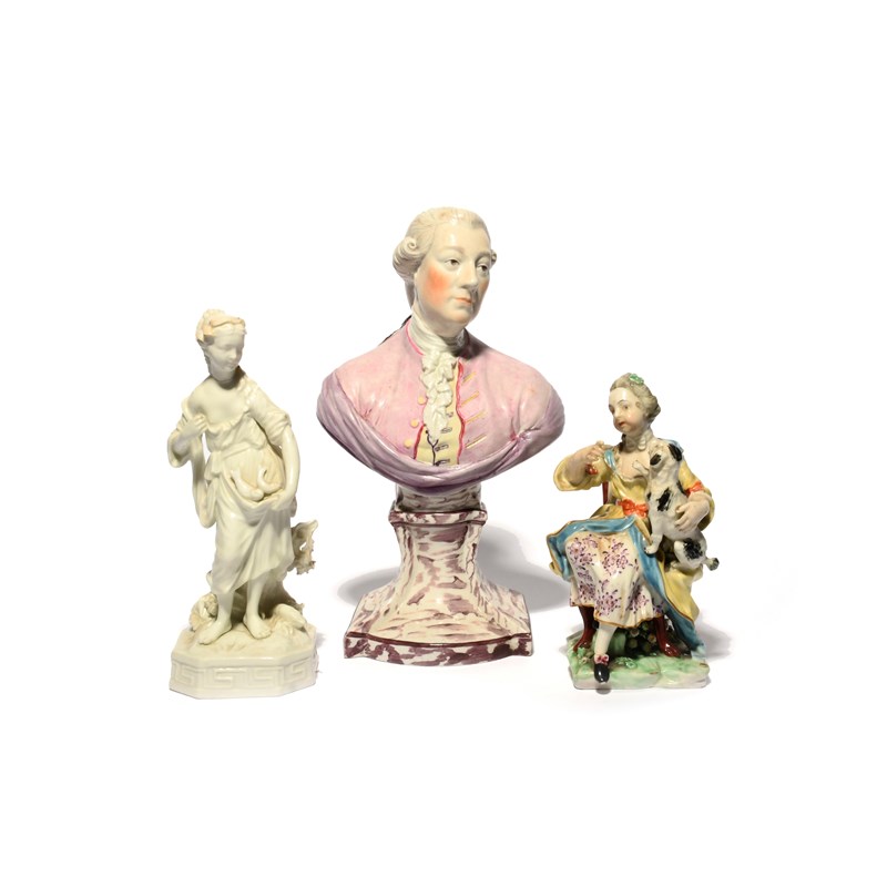 A good pearlware bust of William Pitt the Younger, c.1800, probably Enoch Wood, modelled wearing a powdered wig and with head slightly turned, raised on a faux marble socle base, together with two Derby porcelain figures of a fish seller and a girl with a dog, damages to the Derby, 22cm max. (3)
