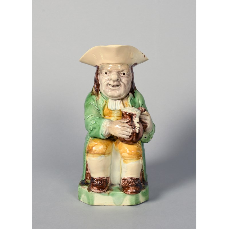 A Ralph Wood Toby jug, c.1785-90, seated with a jug of ale, the foam spilling down one side, wearing a green coat over an ochre waistcoat and breeches, restoration to his hat, 24.3cm.