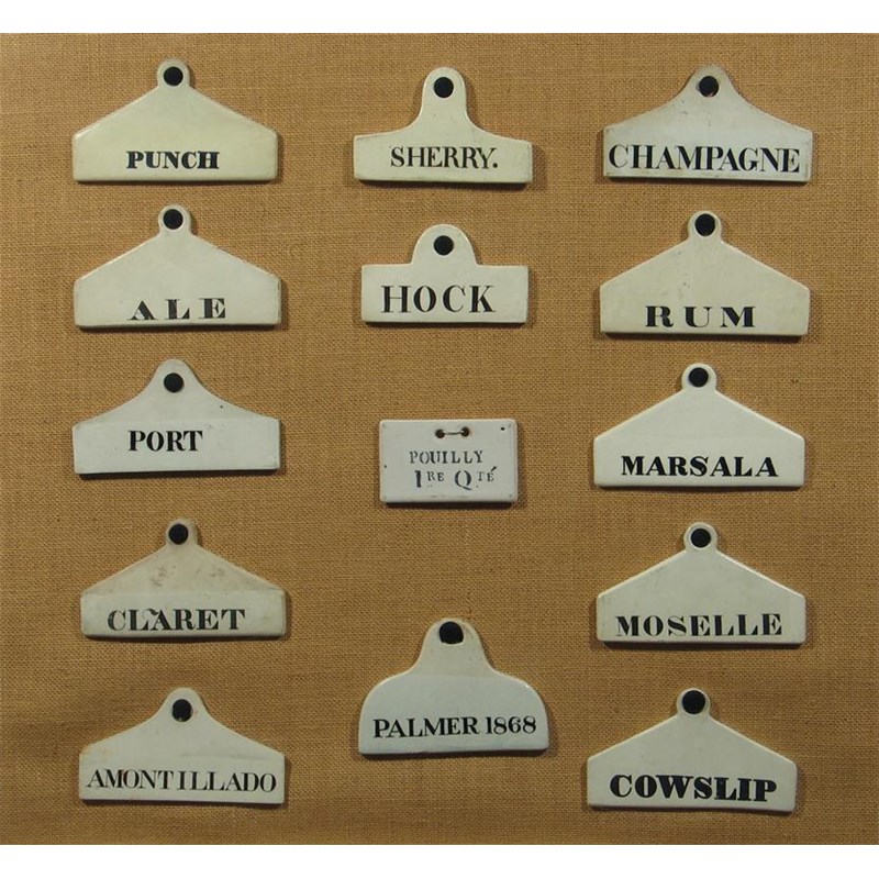 A collection of forty-one ceramic bin labels, mounted in three glazed frames, the labels inscribed: Hollands, Manzanilla, Barsac, Bucellas, Porter, Burgundy, Cognac, Goosberry, Contantia, Dry Malaga, Frontigniac, Champagne, Punch, Sherry, Champagne, Ale, Hock, Rum, Port, Pouilly 1re Qt Marsala, Claret, Moselle, Amontillado, Palmer 1868, Cowslip, Medoc, Madeira, Pale Brandy, Montilla, Calcavella, Sauterne, Light Sherry, Port, Malmsey, Sparkling Moselle, Claret, Curacoa, St Julien, Teneriffe, Sillery. The cases sealed and thus the labels unchecked for factory marks.