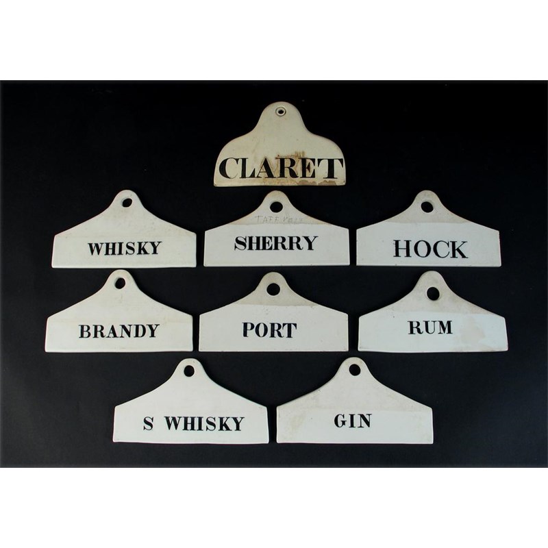 A collection of nine ceramic bin labels, inscribed: Brandy, Claret, Gin, Hock, Port, Rum, Sherry, S Whisky and Whisky, three with impressed marks, two for Farrow and Jackson and one for Burrow, 14cm. (9)