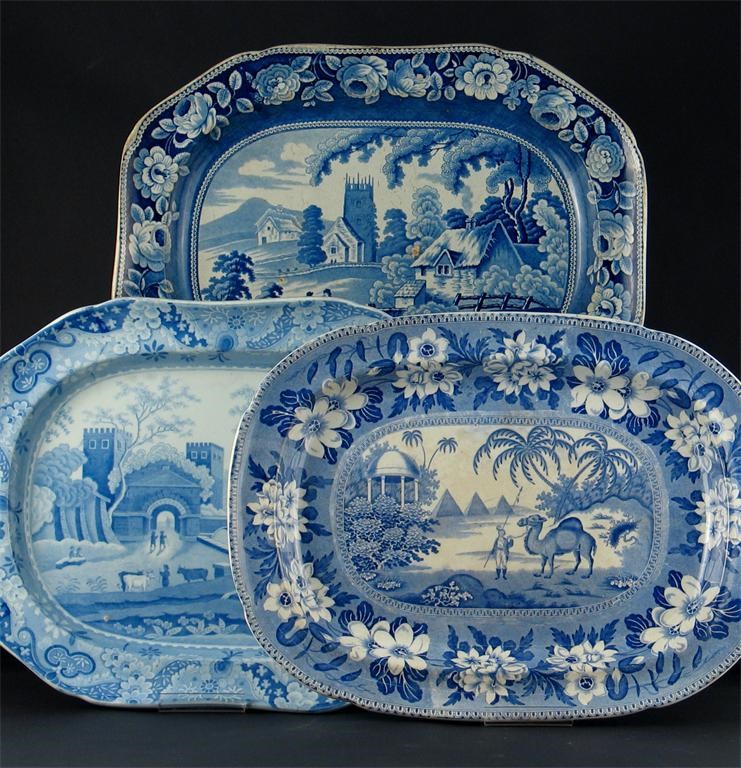 Three blue and white meat plates, printed with buildings, figures and animals including a camel, one marked for Spode, all c.1820-30, 43cm. Max. (3)