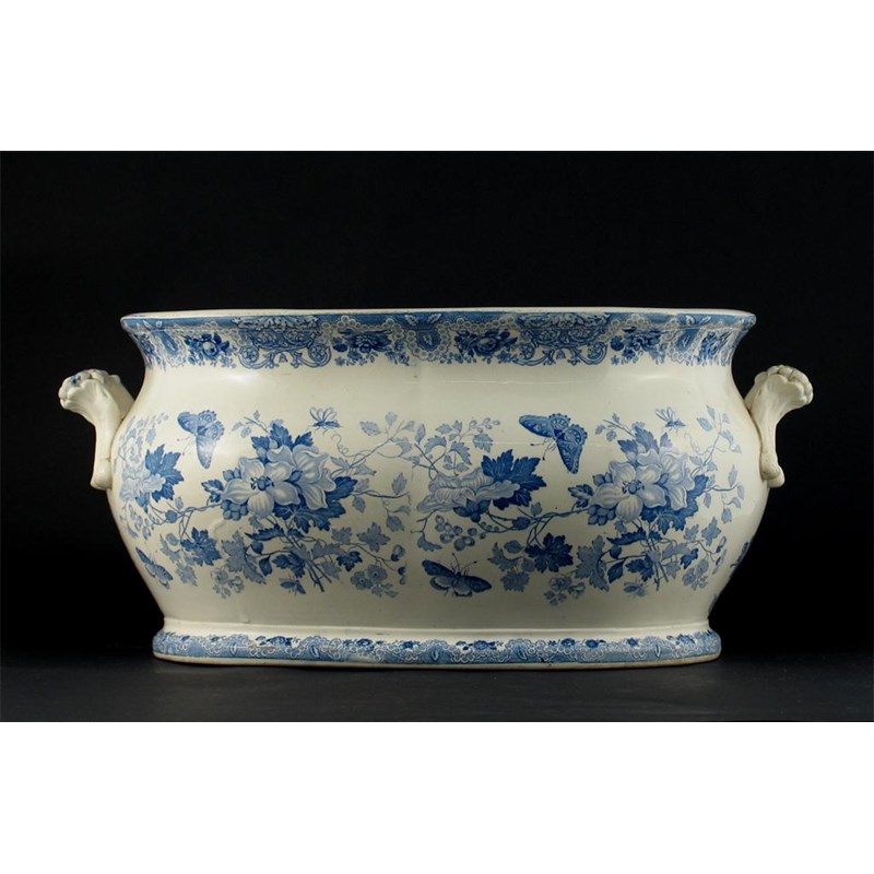 A Staffordshire blue and white oval foot bath, printed with butterflies, bugs and flowers, unmarked. Glaze and hairline cracks. Mid 19th century, 48cm.