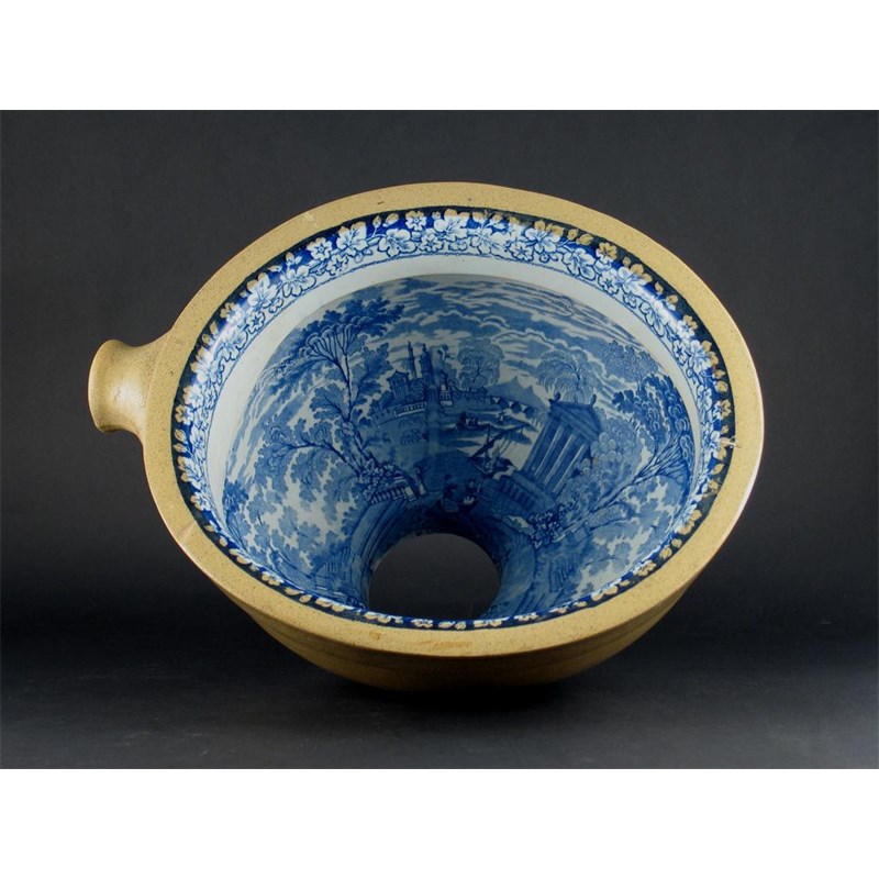A Staffordshire blue and white toilet basin, printed with Italianate buildings, trees and figures and with a floral border, unmarked, 19th century, 43.5cm. Max.