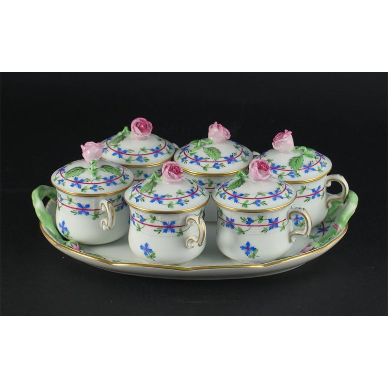A set of six Herend custard cups and covers, with rose finials on an oval tray, 20th century, 28cm. (13)