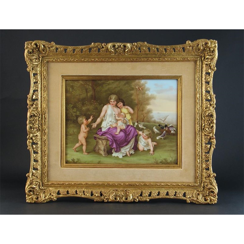 A large Continental porcelain rectangular plaque, painted with a mother and her four children on a lawn leading down to the sea, 19th century, mounted in an elaborate gilt frame, 22cm. x 29cm.