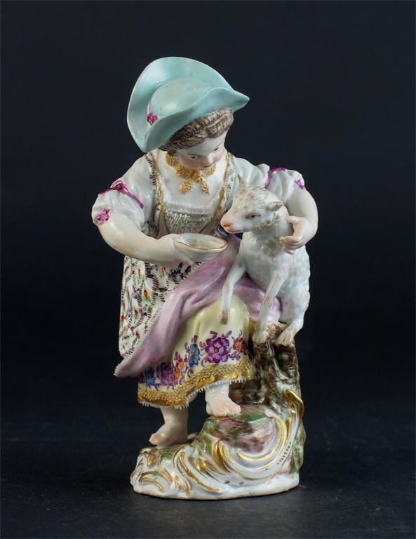 A Meissen model of a young girl, wearing a patterned dress and feeding a lamb, raised on a scroll base, crossed swords and incised marks, 19th century, 12.5cm.