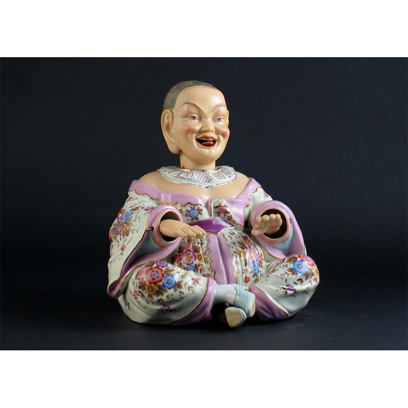 A Continental porcelain pagoda figure, after Meissen, with a nodding head and rocking hands, sitting cross-legged and wearing a floral robe, impressed and printed marks, c.1900, 23.5cm.