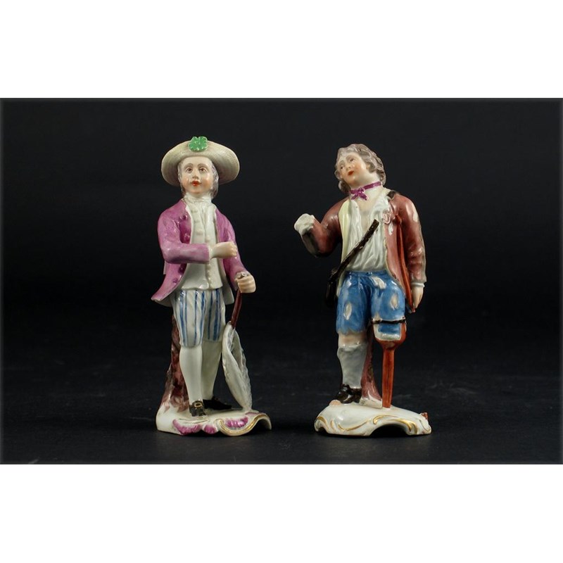Two H figures, one of a man standing holding a net, the other a beggar with a wooden leg, both with red wheel marks, the latter with 'IH' incised. Some damages. c.1755, 11cm. (2)