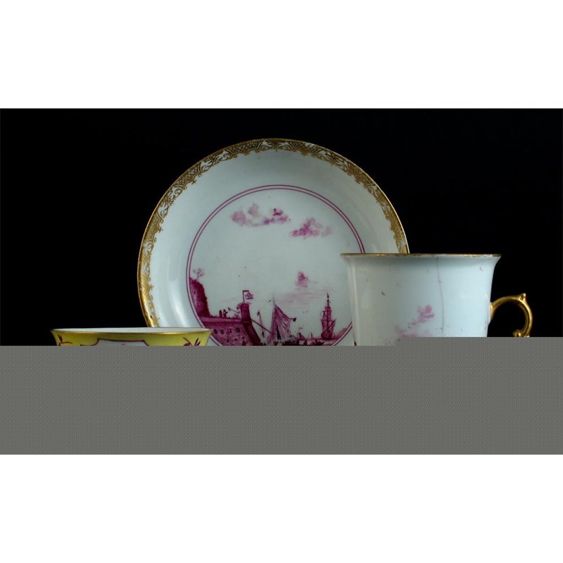 An early Meissen cup and saucer, and a yellow-ground teabowl, all painted in puce with harbour scenes, all with crossed swords marks. The cup damaged, a little wear to the gilding. c.1740. (3)