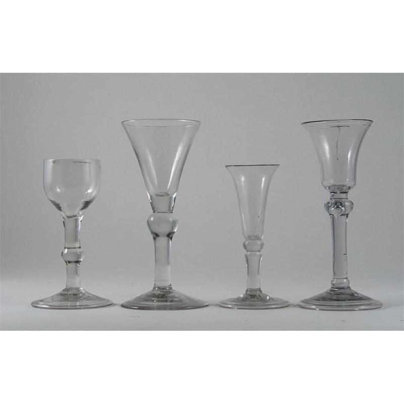 Four glasses, with knopped stems, all with plain bowls, three with folded feet, all 18th century, 16.5cm.