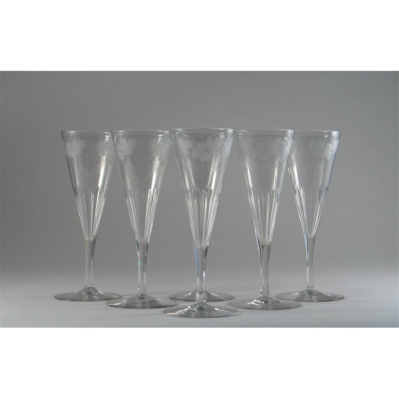A set of six champagne flutes, engraved with bands of fruiting vines, on part faceted bowls, 16.5cm. (6)
