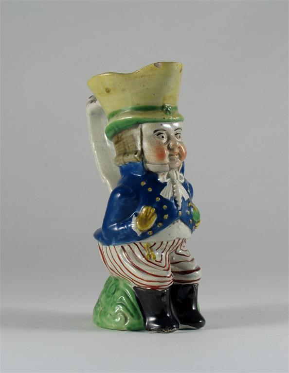 A small pearlware Toby jug, wearing a blue jacket and perched on a mound, c.1830. Small rim chips. 16cm.