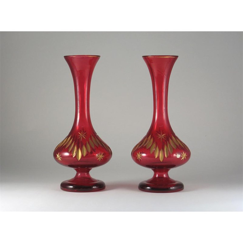A pair of ruby flashed glass vases, the bodies cut with star and lozenge motifs, heightened in gilt, 19th century, 31cm. (2)