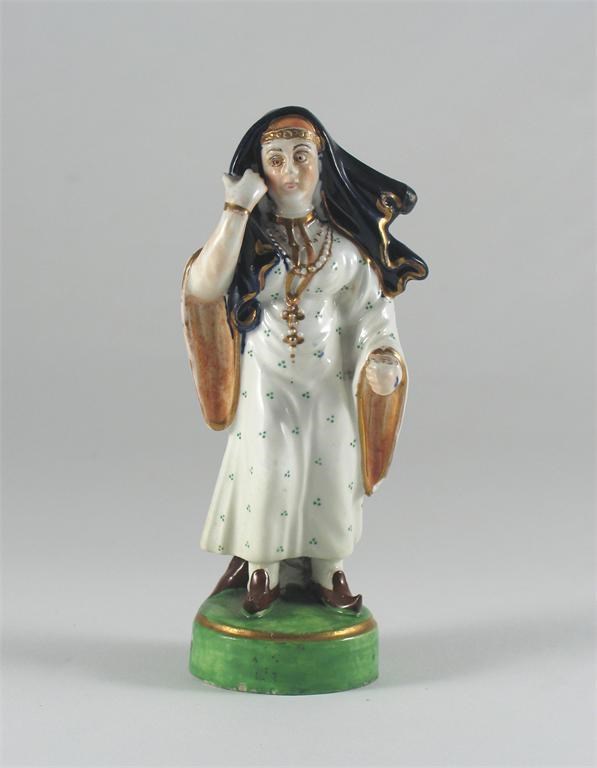 An English porcelain model of a Middle Eastern woman, standing on a green circular base, c.1830, 14cm.