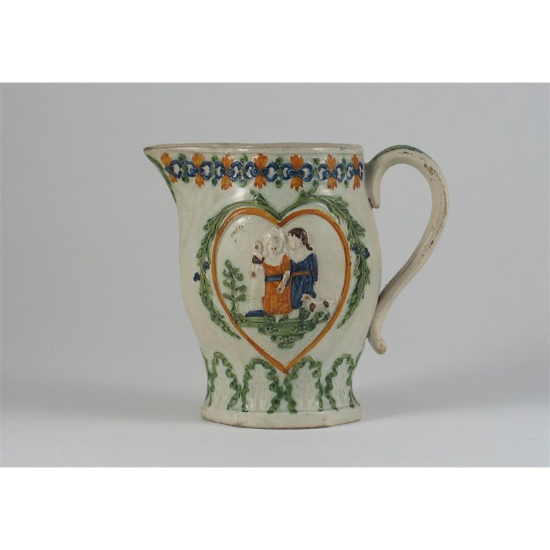 A Prattware moulded jug, decorated with two heart-shaped panels of children, titled 'Sportive Innocence' and 'Mischievous Sport', early 19th century. Small chips to the spout. 12.5cm.