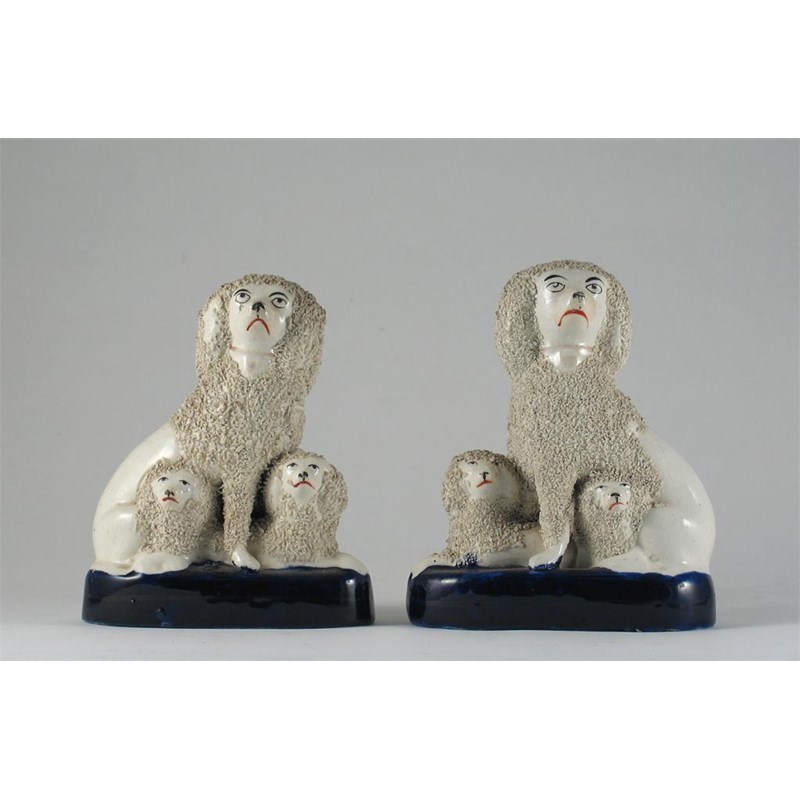 A pair of Staffordshire models of poodles, sitting on blue bases with their puppies, c.1860. A little wear to the gilding. 14.5cm. (2)