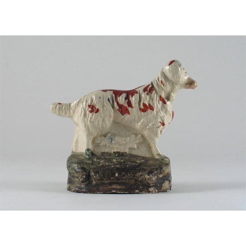 A small Staffordshire model of a spaniel, standing on a green rustic base, mid 19th century, 11cm.