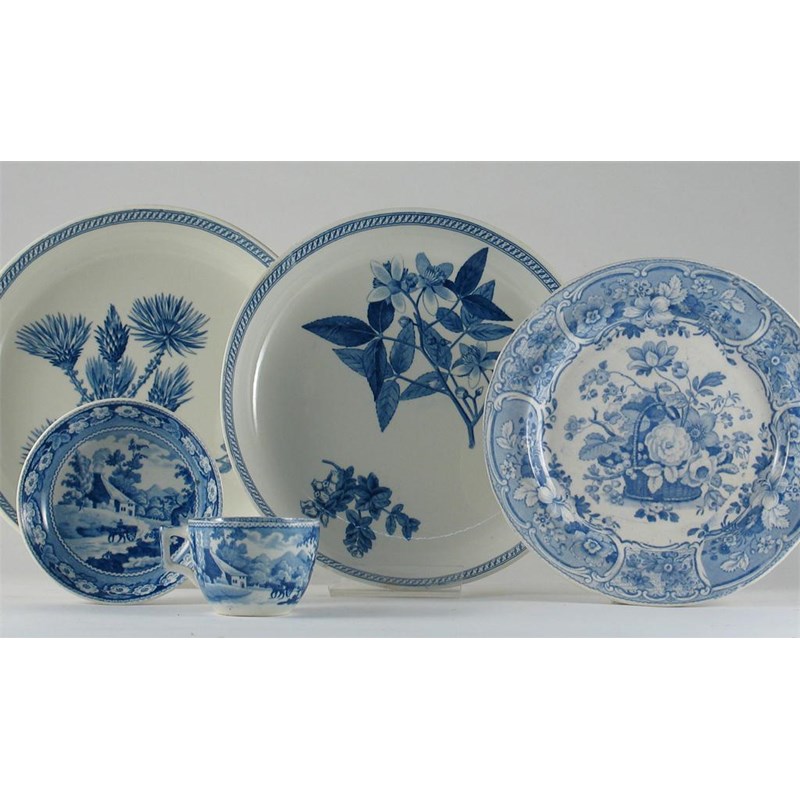 A pair of Wedgwood pearlware dishes, printed with botanical specimens, a small pearlware cup and saucer and a plate printed with a basket of flowers, all 1st half 19th century, 20cm. Max. (5)