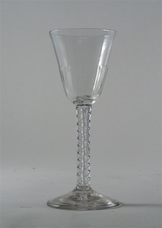 A wine glass with a part moulded bowl, raised on a double series air twist stem, c.1760, 16.5cm.