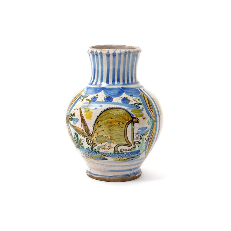 A Sicilian maiolica drug jar or bottle mid 18th century, painted with a large hare or rabbit nibbling on grass, the neck with vertical blue stripes to one side, a short crack to the neck, 20cm.