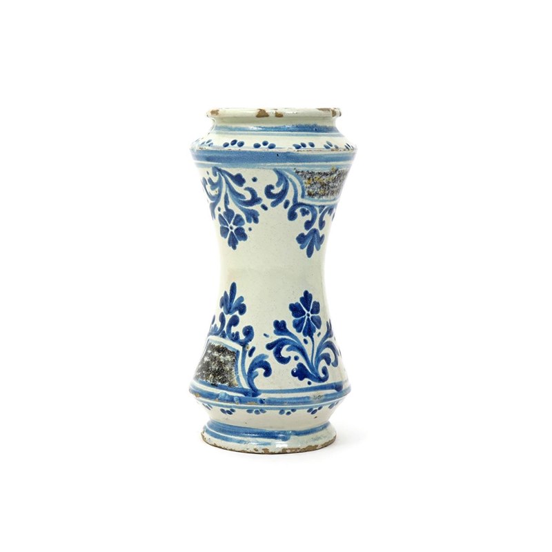 An Italian (Sicily) maiolica albarello c.1700, the waisted form painted with a formal design of blue flower sprays flanking rococo panels sponged in black and ochre, minor faults, 25.5cm.