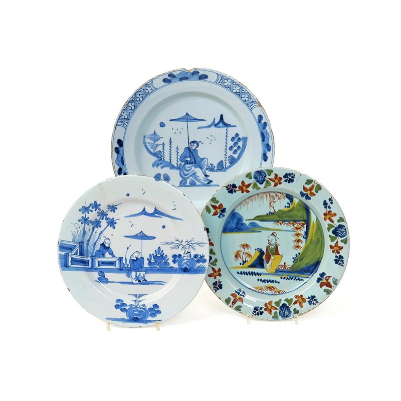 Three delftware plates 18th century, one Lambeth and painted in polychrome enamels with a seated Chinese figure beneath a willow tree, one in blue with a figure holding a parasol, regarded by another figure behind a fence, the last with a single figure holding a parasol above his head within a simple landscape, minor damages, 25.5cm max. (3)