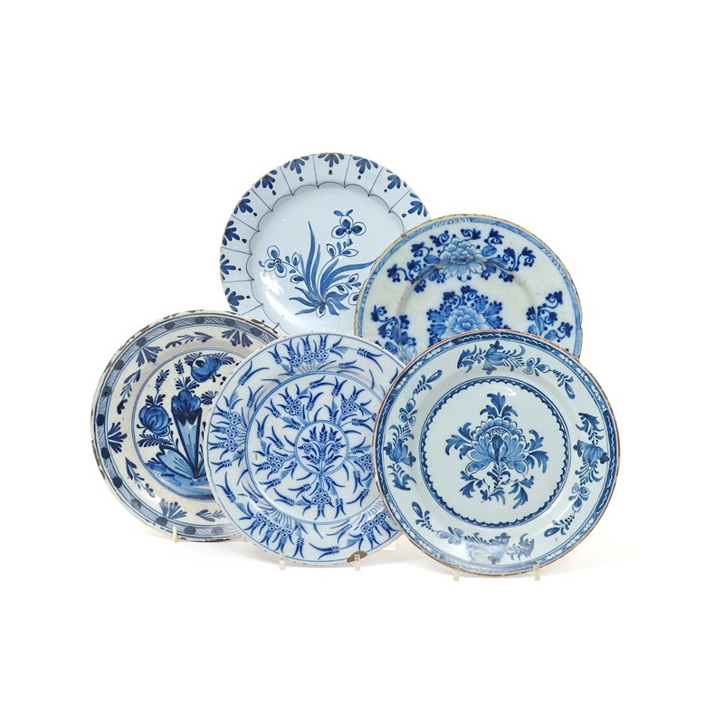 Five Delft and delftware plates 18th century, variously decorated in blue with central designs of peony and other flowers, within formal and foliate borders, some damages, 22.8cm max. (5)