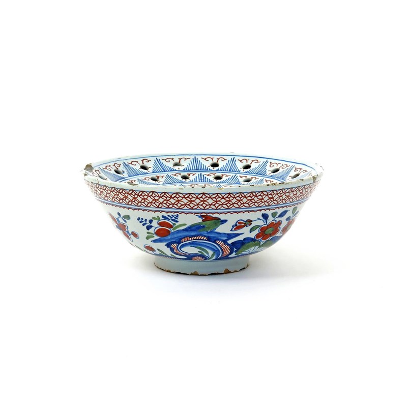 A rare delftware colander bowl c.1740-60, unusually decorated in red, green and blue with birds in flight and perched on holey rockwork among flowering branches, the concave top pierced with four concentric rings of holes around a larger central aperture, some chipping, 22.3cm dia.