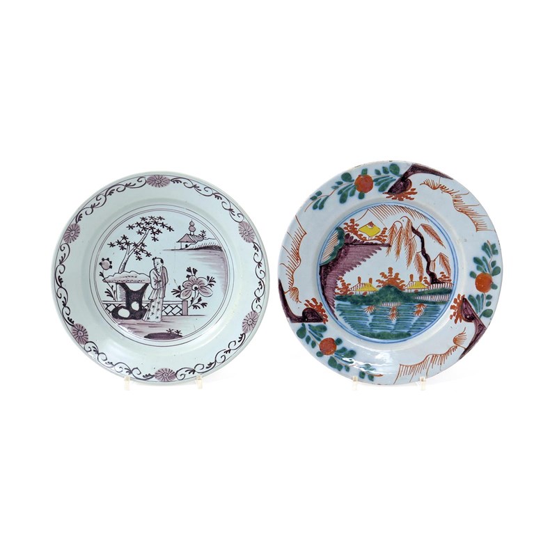 Two Delft plates 18th century, one painted in manganese with a standing Chinaman before an ornamental fence, a small pagoda island in the distance, the other in polychrome enamels with small huts beneath a fringed tree, some restoration to the rims, 23cm max. (2)