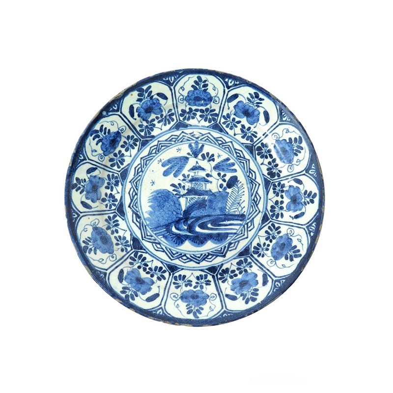 An early delftware small plate c.1710, the well painted with a three-storeyed pagoda within a circular panel with overlapping petal border, the rim with octagonal panels of peony sprays, 19.5cm.