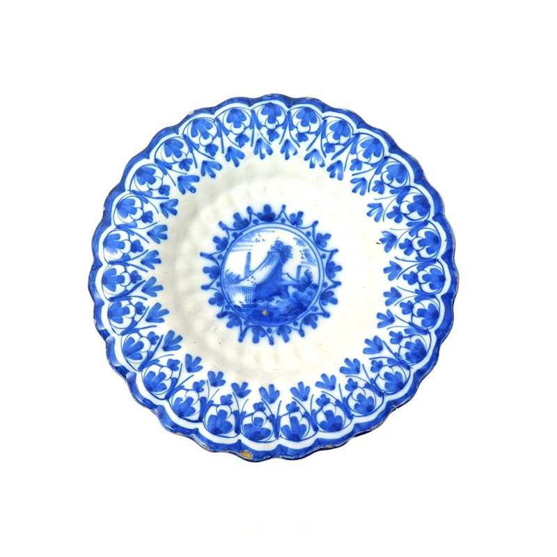 An English delftware lobed dish or cracknell c.1690, probably Brislington, the convex well painted with a small building within a jagged foliate border, moulded with two bands of gadroons, the scalloped rim with further foliate motifs and a tassel design, small faults, 33cm.