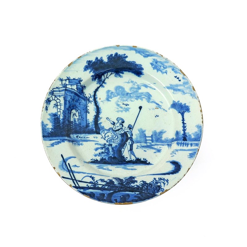 A London delftware charger c.1770, painted in blue with a maiden reclining on a rocky outcrop and attended by a young shepherd, beneath a tall sponged tree and before a ruined archway, small rim chips, 34cm.